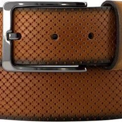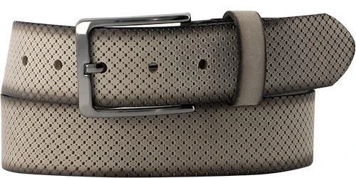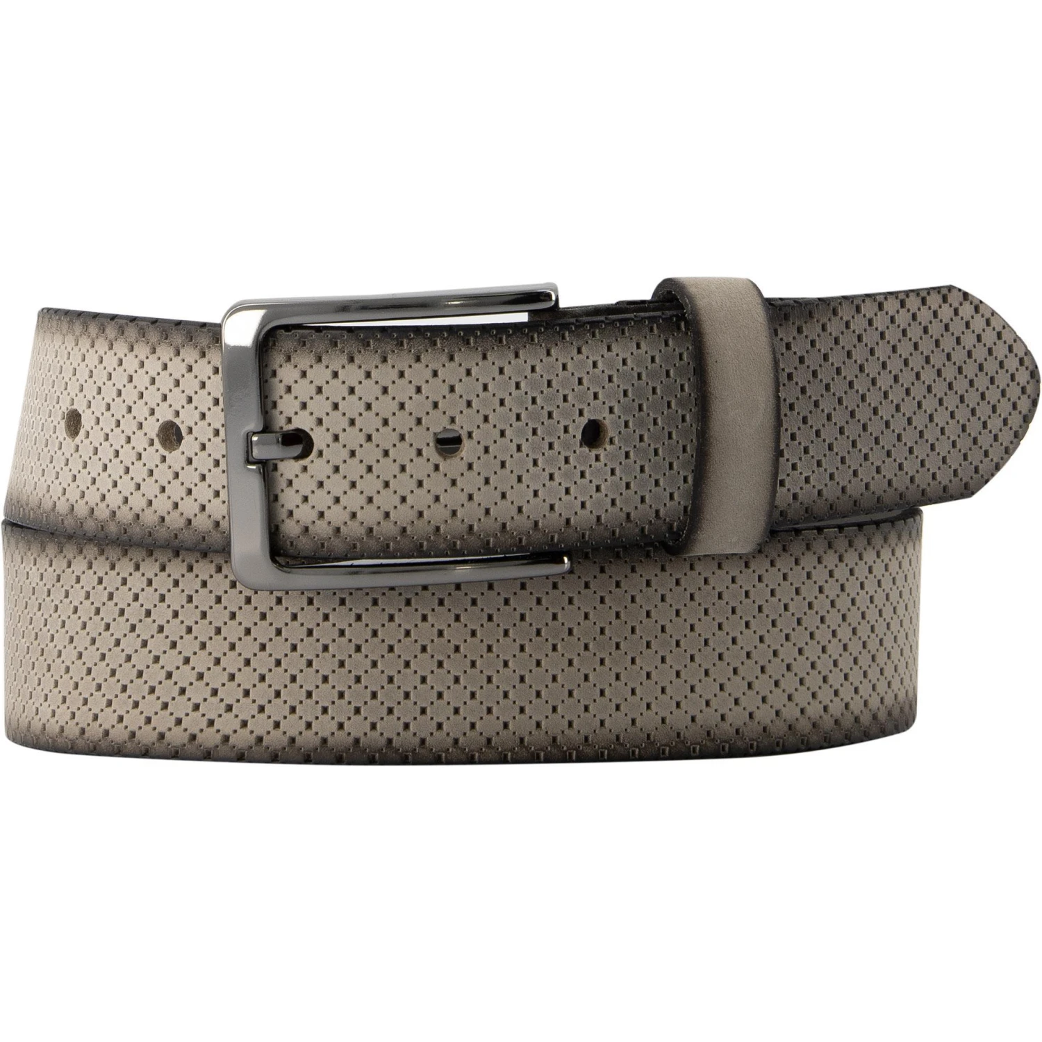 Der offenkantig gearbeitete Gürtel ist aus hochwertigem Rindleder gefertigt. Das Modell präsentiert sich mit einer Rauten-Ornamentprägung und wird mit einer geschwärzten Schließe abgerundet. Für viele Looks ein stilvolles Accessoire.